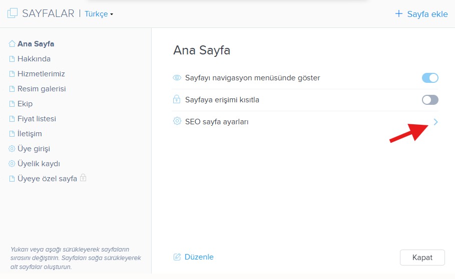 3. Widget’ın görüneceği sayfayı seçin ve ardından SEO Sayfa Ayarları bölümüne tıklayın.