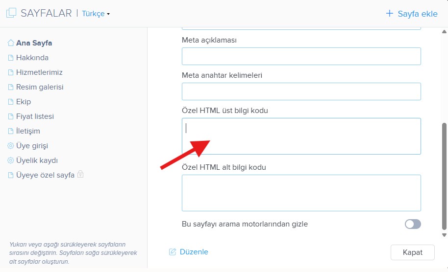 4. İlk kodu, Özel HTML Header Kodu alanına yapıştırın.