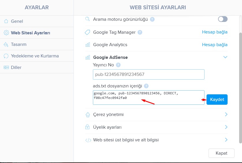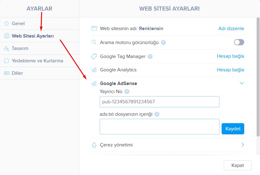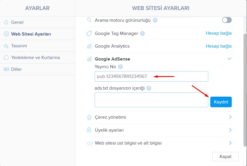 4. Yayıncı Kimliği (Publisher ID) alanına bu kimliği girin ve değişikliği kaydedin. Siteyi yayınlayın.