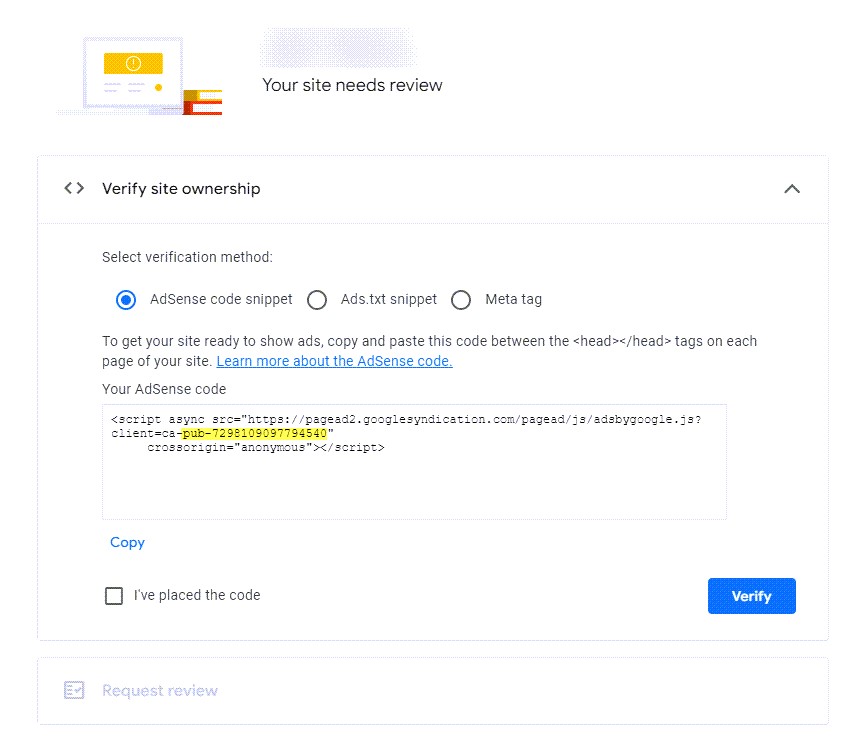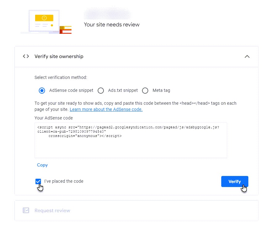 5. AdSense hesabınıza geri dönün ve kodu girdiğinizi kontrol edin, ardından butona basarak onaylayın. Sitenizin onay süreciyle ilgili bilgiler görüntülenecektir. Onay süreci otomatik değildir; manuel kontrol yapılır. Onay 2 gün ile 1 ay arasında sürebilir. Hizmet, sitenizde onaya engel olabilecek uygunsuzluklar bulursa, AdSense hesabınızda bir mesaj görüntülenir ve giriş e-postanıza da bir bildirim gönderilir.