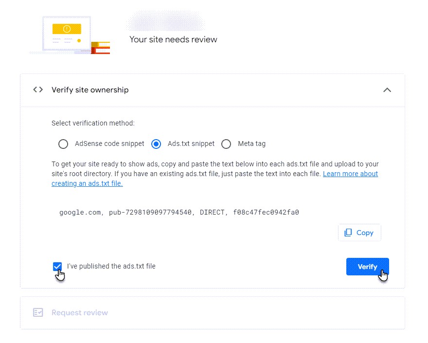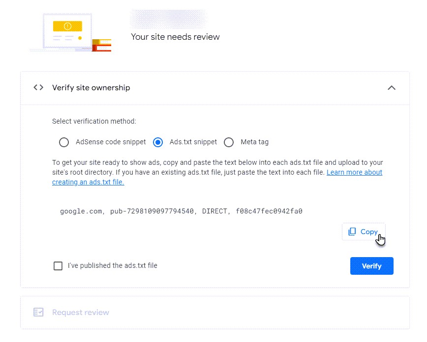 1. AdSense hesabınıza giriş yapın ve ads.txt parçası doğrulama kısmında verilen metni buradan kopyalayın.