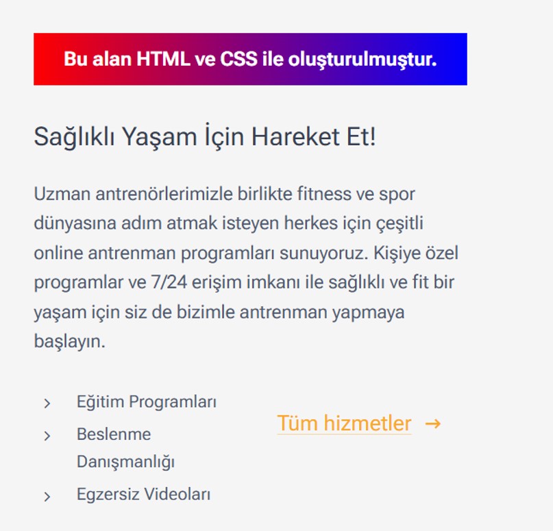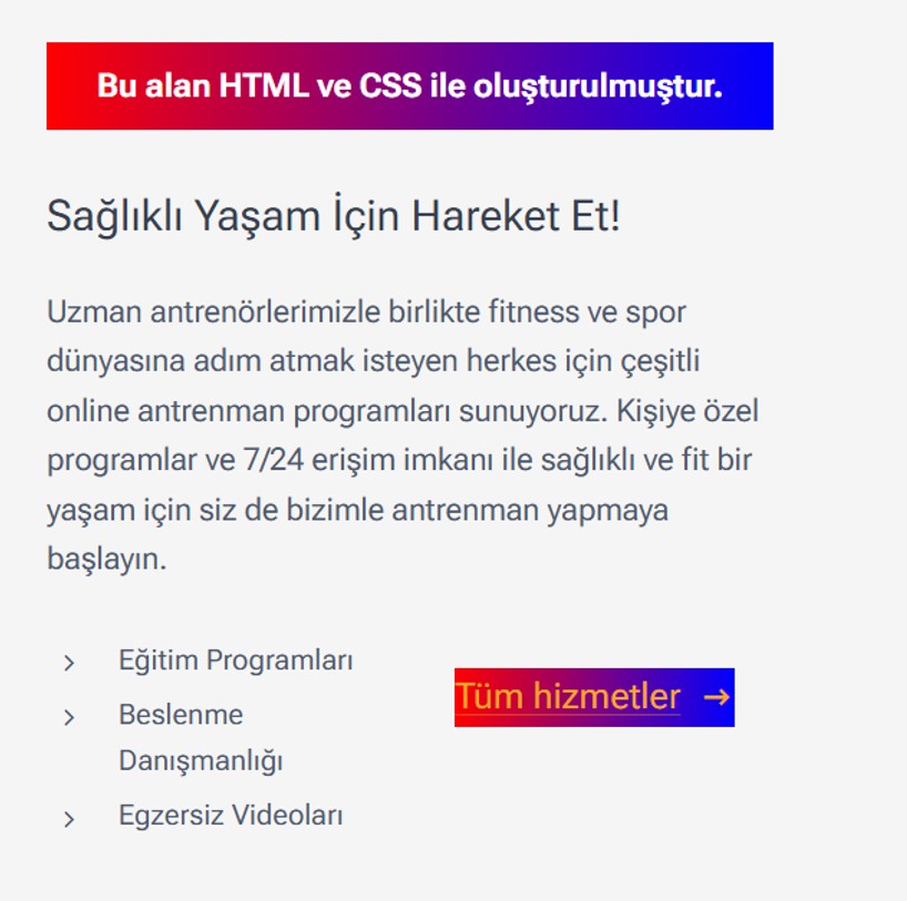 Örneğin: Bu alan HTML ve CSS ile oluşturulmuştur. Bu kod, belirli bir div içeriğini gradyan ile renklendirir.