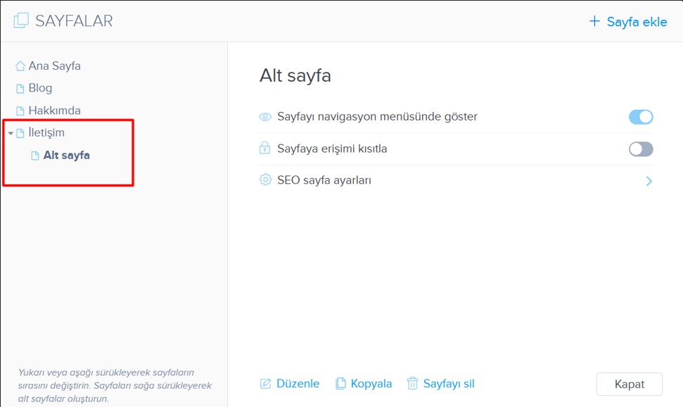 İpucu: Benzer şekilde alt sayfalar (subpages) da ekleyebilirsiniz.