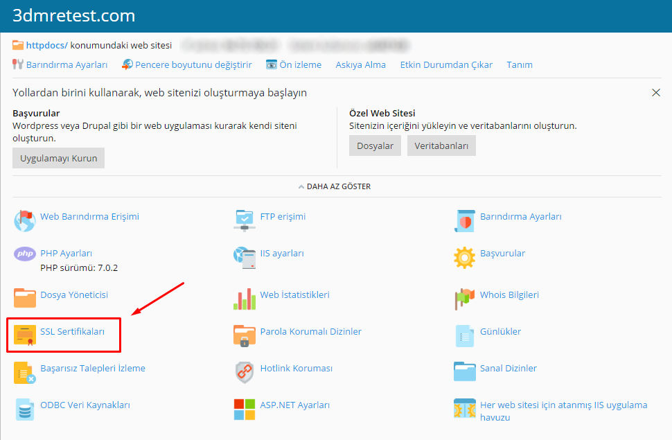 1) Öncelikle Plesk Panel arayüzümüze erişmemiz gerekiyor. Plesk Panel arayüzümüzde sol alt köşede bulunan SSL Sertifikaları butonuna basıyoruz.