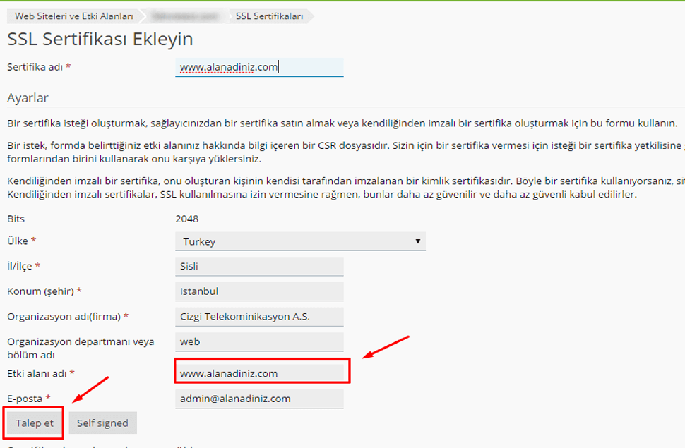 * CSR kodu 2048 bits üzerinden üretilmelidir.