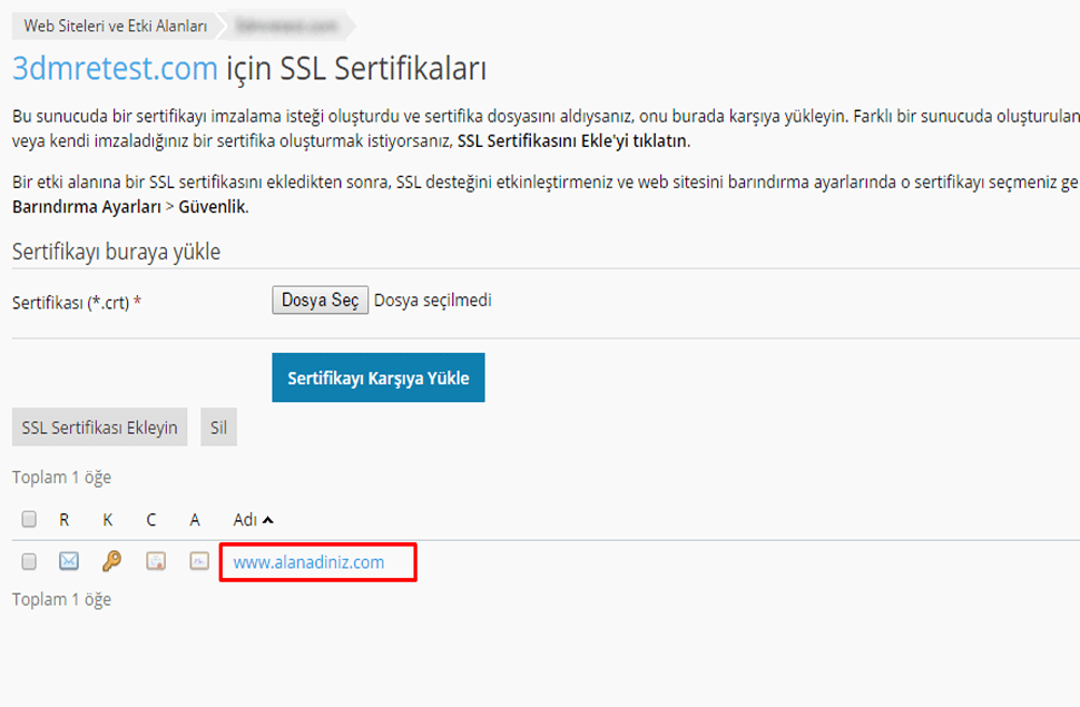 2) SSL Sertifikaları bölümüne girdiğimizde bizi SSL Sertifikası Ekleyin butonu karşılayacak. Butona tıklıyoruz ve CSR kodu üretebilmek için işlem adımlarına başlıyoruz.