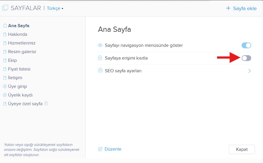 İpucu: Eğer yalnızca ana sayfanın erişimini kısıtlarsanız, sitenin tüm sayfaları kilitlenmiş olur.