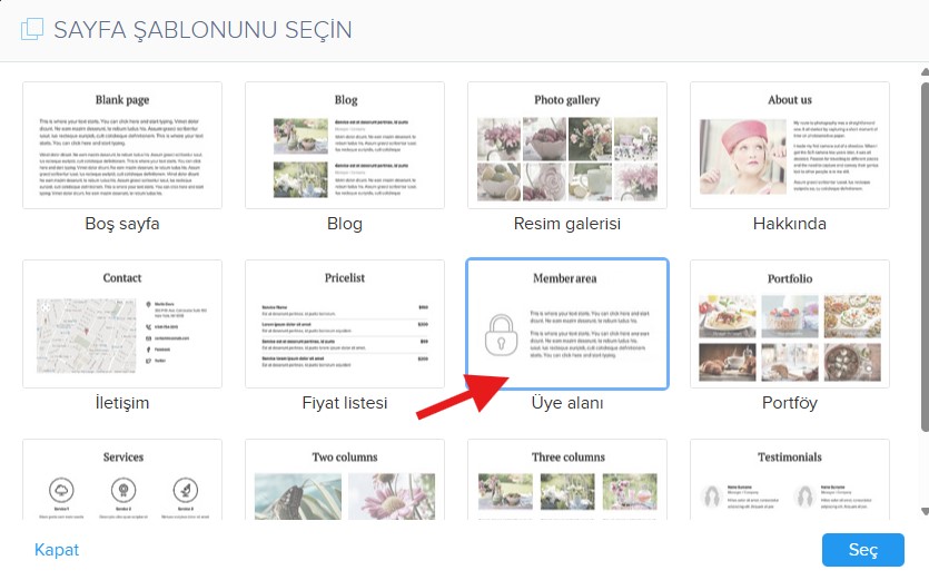 3. Otomatik olarak parola korumalı olacak yeni bir sayfa oluşturmak isterseniz, sayfa oluştururken Üye Alanı şablonunu seçin.